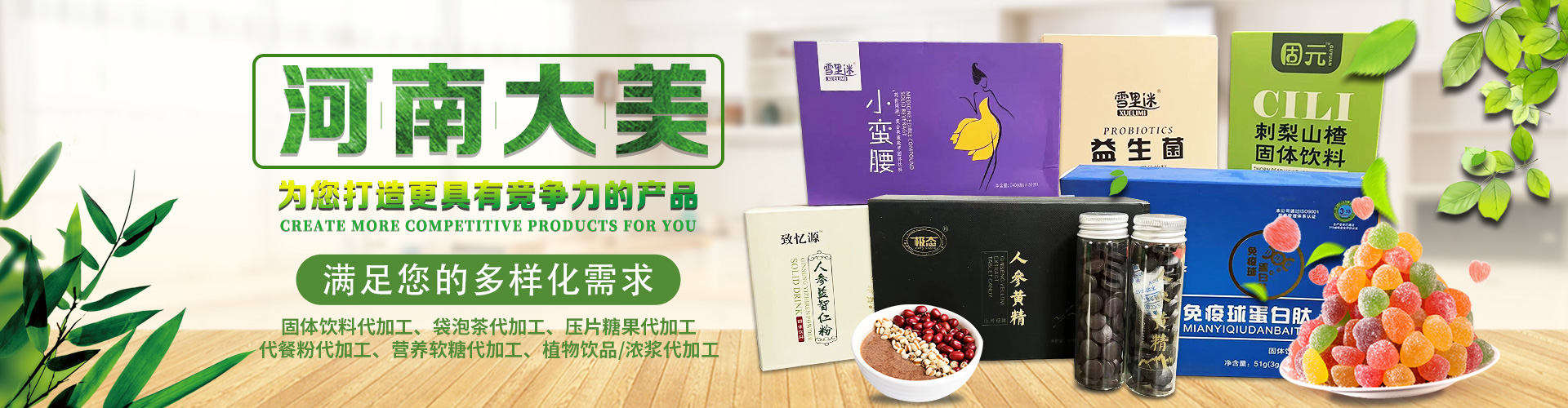 河南大美生物科技股份有限公司是從事顆粒劑、(固體飲料類),壓片糖果代加工等研發和銷售為一體的生產企業。公司依托自身的高科技研發隊伍和營銷團隊,為國內外客戶提供營養食品各劑型和規格的研制、生產、配方設計、批文申報等服務,并為客戶提供多種形式的流通渠道及產品銷售服務工作。 您的要求就是我們的使命!我們的宗旨是與客戶“合作共贏,攜手向前”,共同創造事業新的輝煌!